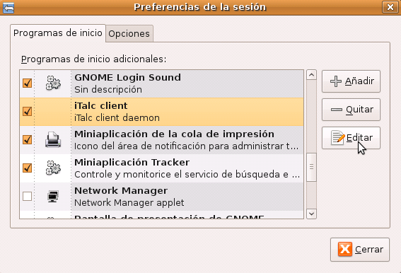 Seleccionamos la entrada correspondiente al iTalc client (cliente de iTalc) y pulsamos sobre el botón Editar.