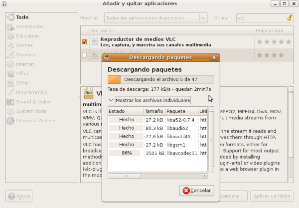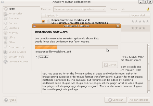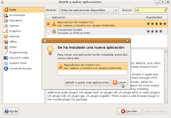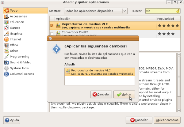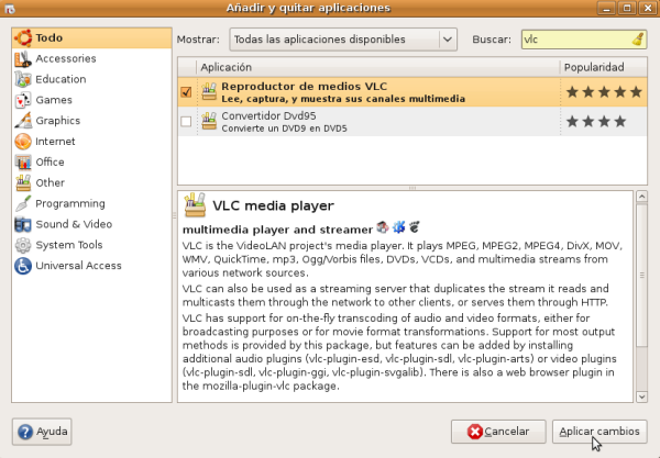 VLC media player es un reproductor multimedia portátil para varios formatos de audio y vídeo (MPEG-1, MPEG-2, MPEG-4, DivX, mp3, ogg, ...) así como DVDs, VCDs, y varios protocolos de streaming. También puede ser usado como servidor para transmitir en unicast o multicast, en IPv4 o IPv6 en redes con un gran ancho de banda. Para instalarlo abrimos el instalador de aplicaciones. En el cuadro de diálogo Buscar del instalador de aplicaciones escribimos vlc y rápidamente veremos que aparece la aplicación buscada. Marcamos la casilla de verificación y pulsamos el botón de Aplicar cambios.