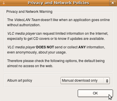 A continuación lanzaremos la aplicación desde el menú Aplicaciones->Sonido y vídeo->VLC media player. Se nos mostrará una pantalla con información sobre las políticas de privacidad y red de VLC. Pulsamos el botón OK para comenzar a usar el programa.