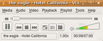 A continuación seleccionamos un archivo de audio (en nuestro caso hotel_california.mp3) para reproducir. Para ello seleccione Media->Open file, navegue hasta la carpeta donde se encuentra el archivo que desea reproducir y después selecciónelo. El archivo comenzará a reproducirse siempre que los altavoces estén conectados y la tarjeta de sonido esté correctamente configurada.