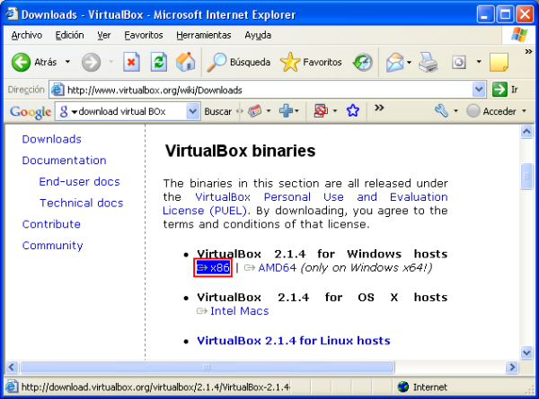 En el momento de desarrollar los contenidos de este material, "VirtualBox" podía ser descargado libremente desde la red, navegando para ello hasta la dirección URL "http://www.virtualbox.org/wiki/Downloads", pasando a ser mostrada como resultado de dicha acción una ventana de características similares a la mostrada en la imagen inferior, en la cual haremos clic sobre el enlace "VirtualBox 2.1.4 for Windows host".