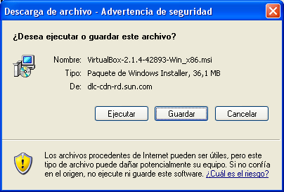Una vez concluido el proceso de descarga, ya estaremos en disposición de instalar el producto "VirtualBox 2.1.4" en nuestro equipo, proceso que llevaremos a cabo con posterioridad..
