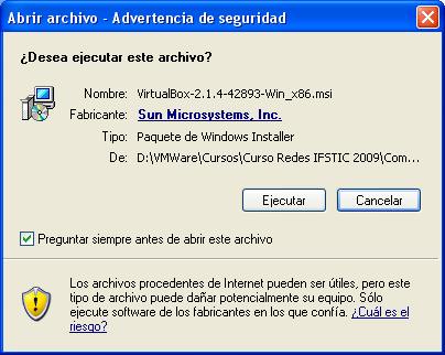 Para proceder con la instalación de "VirtualBox", haremos doble clic sobre el fichero "VirtualBox-2.1.4-42893-Win_x86.msi" descargado con anterioridad, pasando a ser mostrada la siguiente ventana, en la cual pulsaremos directamente sobre el botón "Ejecutar".