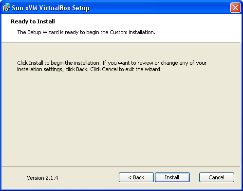 El asistente nos informa a través de la siguiente ventana, de que se encuentra listo para instalar el producto, luego pulsaremos en ella sobre el botón "Install" para dar comienzo efectivo al proceso de instalación de "VirtualBox 2.1.4".