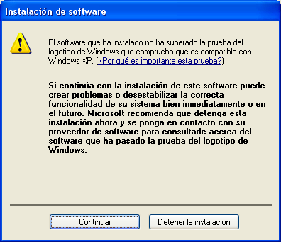 Durante el proceso de instalación del producto, por 2 veces se nos mostrará la siguiente ventana, que nos indica que el software no ha superado la prueba de compatibilidad con Windows XP, advertencias que ignoraremos pulsando en las respectivas ventanas sobre el botón "Continuar".