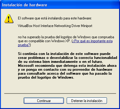 Además de lo anterior, también nos será mostrado durante el proceso de instalación otra advertencia relativa a que el software "VirtualBox Host Interface Networking Driver Miniport" no ha superado la prueba de compatibilidad con Windows XP; de nuevo ignoraremos dicha advertencia, pulsando en la ventana de la imagen inferior sobre el botón "Continuar".