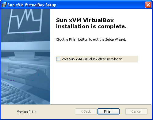 Una vez completado el proceso de instalación, se mostrará la siguiente ventana, en la cual desactivaremos la casilla "Start Sun xVM VirtualBox after installation", y tras ello pulsaremos sobre el botón "Finish", para poder dar por concluido el proceso de instalación de la aplicación.