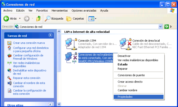 Así pues para conectar a nuestra red el dispositivo móvil en cuestión, cargaremos dicho dispositivo, tras lo cual para establecer su configuración inalámbrica, en primer lugar deberemos ejecutar "Inicio à Panel de Control à Conexiones de red e Internet", y en la nueva ventana mostrada hacer clic sobre el enlace "Conexiones de red", pasando a ser mostrada la siguiente ventana, en la que nos situaremos sobre el icono de "Conexiones de red inalámbricas", pulsando sobre él con el botón derecho del ratón, para elegir la opción "Propiedades".