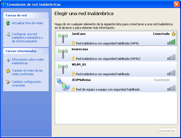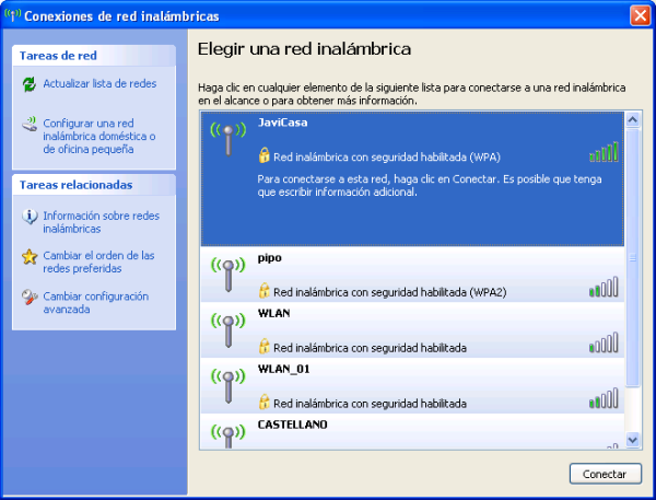 En ese instante pasarán a ser visualizadas todas las redes inalámbricas que se encuentran al alcance de nuestro equipo portátil, entre ellas la correspondiente a nuestra red, "JaviCasa" en este caso, tal y como vemos en la imagen inferior.