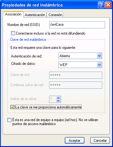 Si el punto de acceso inalámbrico tuviera asociado un cifrado de tipo "WEP", seleccionaremos en el desplegable "Autenticación de red" el valor "Abierta", en el desplegable "Cifrado de datos" el valor "WEP", y en las cajas de texto "Clave de red" y "Confirmar la clave de red", teclearíamos la clave de cifrado correspondiente, para finalmente activar la casilla "La clave se proporciona automáticamente", tal y como vemos en la imagen inferior, tras lo cual haríamos clic sobre el botón "Aceptar" en dicha ventana.