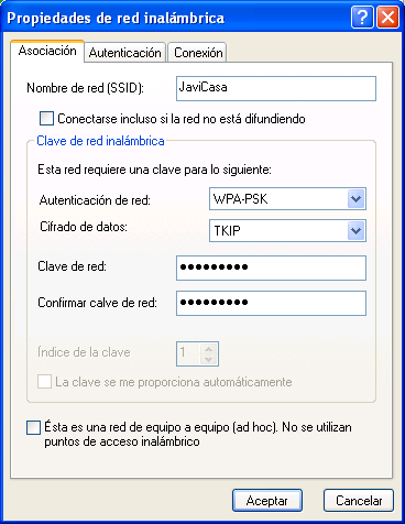 Si por contra el punto de acceso inalámbrico tuviera asociado un cifrado de tipo "WPA-PSK", seleccionaremos en el desplegable "Autenticación de red" el valor "WPA-PSK", en el desplegable "Cifrado de datos" el valor "TKIP", y en las cajas de texto "Clave de red" y "Confirmar la clave de red", teclearíamos la clave de cifrado correspondiente, tal y como vemos en la imagen inferior, tras lo cual haríamos clic sobre el botón "Aceptar" en dicha ventana.
