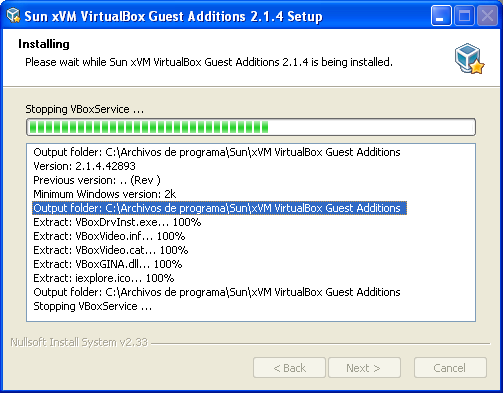 Dará comienzo en este instante la instalación de las aplicaciones de huésped de VirtualBox en el equipo en cuestión, tal y como vemos en la siguiente imagen.