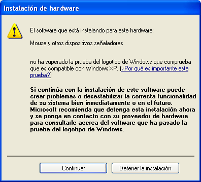 Posteriormente de nuevo durante el proceso de instalación nos será mostrada la siguiente ventana, en la que se nos informará de que el controlador del ratón que vamos a instalar no está validado para este sistema operativo, pese a lo cual pulsaremos nuevamente en la ventana de la imagen inferior sobre el botón "Continuar".