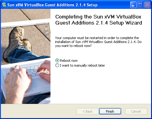 Una vez completado en su totalidad el proceso de instalación, se nos presentará la siguiente ventana, en la que dejaremos seleccionado el radio botón "Reboot now" para proceder al reinicio de la máquina virtual "Windows XP Professional", para que puedan comenzar a utilizarse las herramientas instaladas.