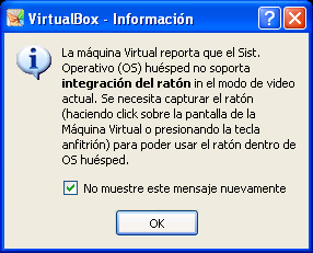 NOTA: Tras el correspondiente reinicio, es posible que VirtualBox nos presente la siguiente ventana, que nos informa de que para utilizar el ratón en la máquina huésped, deberemos pulsar sobre el mismo sobre la máquina huésped; activaremos en dicha ventana la casilla "No muestre este mensaje nuevamente", y tras ello pulsaremos en dicha ventana sobre el botón "OK" para proceder a su cierre.