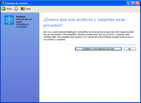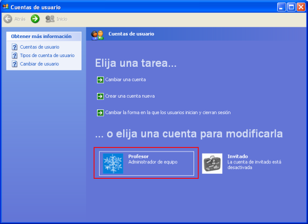 Para ello ejecutaremos "Inicio ► Panel de control ► Cuentas de usuario", pasando a ser mostrada la siguiente ventana, en la cual haremos clic sobre el icono correspondiente al usuario "Profesor".