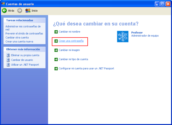 Como resultado de la acción anterior pasará a ser mostrada la siguiente ventana, donde podremos configurar diversas opciones para el usuario "Profesor"; en nuestro caso haremos clic sobre el enlace "Crear una contraseña".