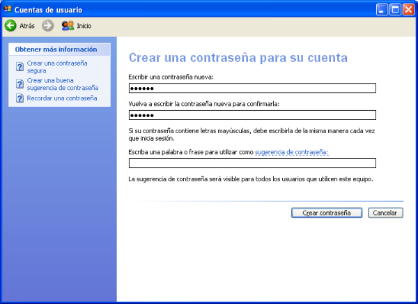 Indicaremos en las cajas de texto correspondientes la contraseña deseada (hemos de teclearla en las dos primeras cajas de texto para confirmar que está bien escrita, pues la contraseña se oculta, mostrándose únicamente caracteres correspondientes al símbolo "●"), y posteriormente pulsamos sobre el botón "Crear contraseña".
