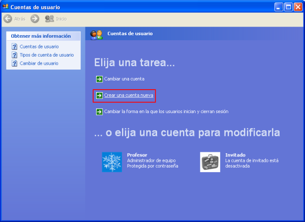 Para crear al usuario reseñado en el párrafo anterior, y autenticados en sesión de trabajo con las credenciales del usuario "Profesor", ejecutaremos "Inicio ► Panel de control ► Cuentas de usuario", pasando a ser mostrada la siguiente ventana, en la que pulsaremos sobre el enlace "Crear una cuenta nueva".