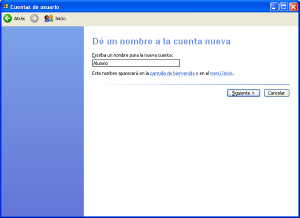 Pasaremos a continuación a la siguiente ventana, en la cual especificamos el nombre que deseamos asociar al nuevo usuario que vamos a crear; en nuestro caso indicaremos el nombre "Alumno" en la caja de texto correspondiente, y a continuación pulsaremos sobre el botón "Siguiente".