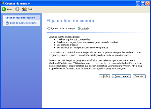 En la siguiente ventana mostrada seleccionaremos el radio botón "Limitada" para especificar que el usuario "Alumno" tendrá ciertas limitaciones (las comentadas anteriormente), y posteriormente pulsaremos sobre el botón "Crear cuenta" para proceder con la creación de una cuenta para dicho usuario.