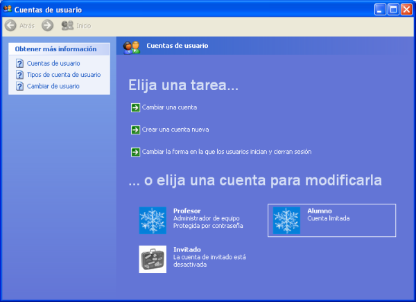 A continuación crearemos un nuevo usuario local en el equipo "Windows XP Professional", usuario que tendrá asociado un rol de alumno, de modo que dicho usuario no pueda modificar configuraciones del sistema, borrar ficheros, ni instalar o desinstalar aplicaciones, para evitar un mal funcionamiento de la máquina, si bien podrá hacer un uso funcional de dicho equipo totalmente normal, pudiendo navegar por Internet, ejecutar las aplicaciones instaladas en el equipo, etc.
