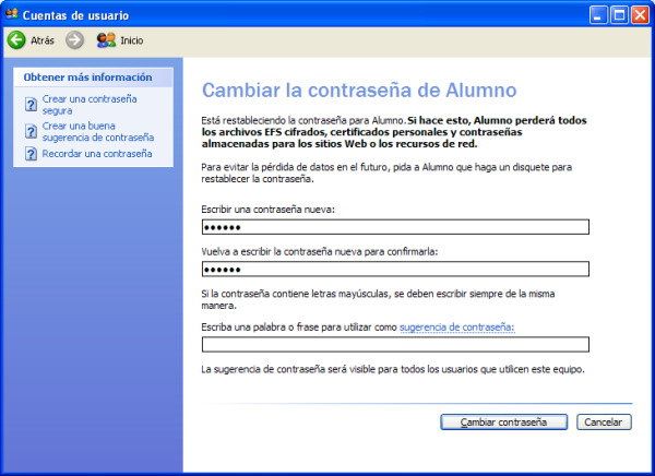 Tras ello asociamos la contraseña deseada al usuario "Alumno", tecleándola por duplicado en las cajas de texto correspondientes, tal y como vemos en la ventana de la imagen inferior, tras lo cual pulsaremos sobre el botón "Cambiar contraseña".
