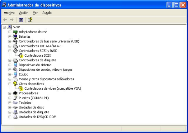 En la ventana de la imagen anterior, pulsaremos sobre el botón "Administrador de dispositivos", pasando a ser visualizada una nueva ventana donde se mostrarán todos los dispositivos de los que dispone nuestro equipo. Puede ocurrir, tal y como se ve en la siguiente imagen, que alguno de ellos tenga asociado un icono con forma de círculo amarillo en cuyo interior se muestra una admiración negra; eso significa que el sistema ha encontrado en el proceso de instalación la existencia de un elemento hardware, pero que no dispone de los controladores adecuados para configurarlo correctamente, y por tanto actualmente dicho dispositivo no podrá ser utilizado.