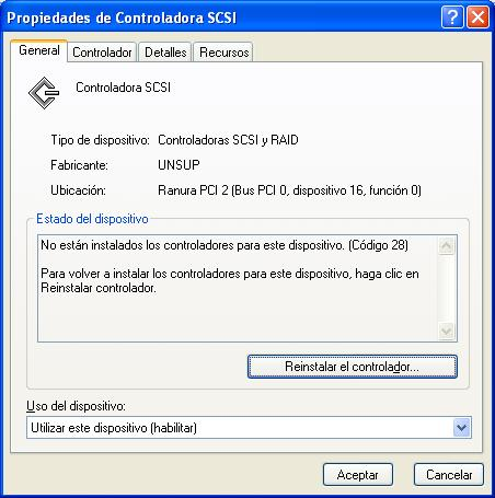 En el caso que nos ocupa, por ejemplo, vamos a configurar la "Controladora SCSI", suministrándole el controlador (también conocido como "driver") adecuado; para ello nos situaremos en la ventana de la imagen anterior sobre dicho dispositivo, y haremos doble clic sobre él, pasando a ser mostrada a continuación la siguiente ventana, en la cual nos ubicaremos sobre la pestaña "General", para posteriormente pulsar sobre el botón "Reinstalar el controlador".