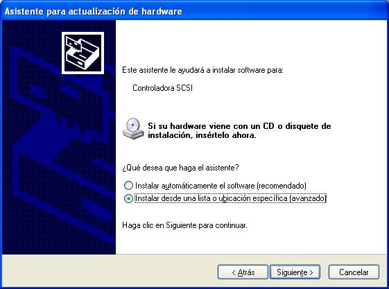 Como resultado de la acción anterior, será mostrada la siguiente ventana, en la que deberemos especificar si deseamos que Windows XP Professional busque automáticamente el controlador en el equipo, o bien seremos nosotros los que indicaremos el lugar donde se encuentra dicho controlador, seleccionando en nuestro caso esta segunda opción, pues la primera es la que el propio Windows XP Professional ya ha intentado en su proceso de instalación, fracasando en el intento.