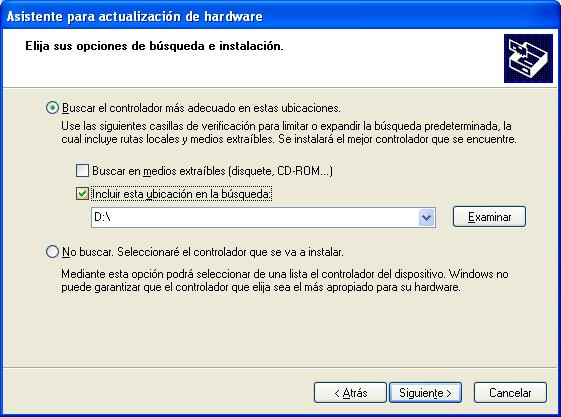 En la siguiente ventana del asistente activaremos la casilla "Incluir esta ubicación en la búsqueda", y a continuación pulsaremos sobre el botón "Examinar" para navegar hasta la unidad donde supuestamente se encuentra el controlador (la unidad "D:\" en este caso, por tanto daremos por supuesto que ya hemos introducido el CD o DVD con el controlador oportuno en la unidad "D:" del equipo), de modo que finalmente en la caja de texto correspondiente a dicha casilla aparezca reflejada la unidad en cuestión, tal y como se ve en la siguiente imagen; posteriormente pulsaremos sobre el botón "Siguiente" para continuar con el proceso de instalación del driver oportuno.