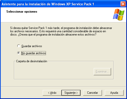 A continuación el asistente nos ofrece la posibilidad de almacenar los archivos necesarios para poder desinstalar posteriormente el SP1 de nuestro equipo, si ese fuera nuestro interés; dado que no tenemos ninguna intención de desinstalar el SP1 de Windows XP, en la ventana de la imagen inferior seleccionaremos el radio botón "No guardar archivos", y tras ello pulsaremos sobre el botón "Siguiente", para continuar con el proceso de instalación del SP1 de Windows XP.