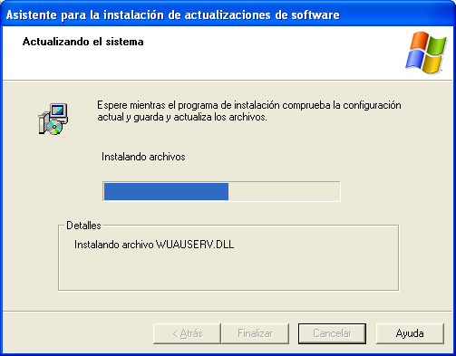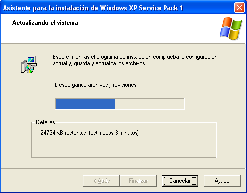 En este instante da comienzo el proceso de instalación del SP1 de Windows XP, luego esperaremos pacientemente a que se complete dicho proceso.
