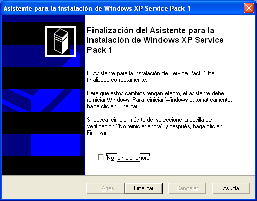 Una vez completada la instalación del SP1 de Windows XP, el sistema mostrará la siguiente ventana, en la cual pulsaremos directamente sobre el botón "Finalizar", para que el equipo se reinicie y pase a ser aplicado dicho service pack de modo efectivo.