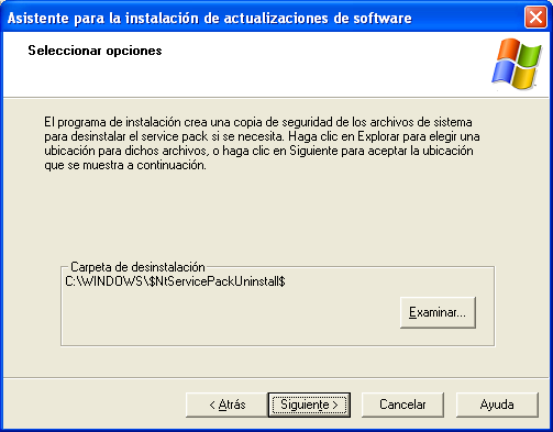 A continuación el asistente nos informa de que será creada una copia de seguridad con los archivos necesarios para poder desinstalar el SP3 de Windows XP si fuera preciso, así pues en la ventana de la imagen inferior pulsaremos directamente sobre el botón "Siguiente", para continuar con el proceso de instalación del SP3 de Windows XP.