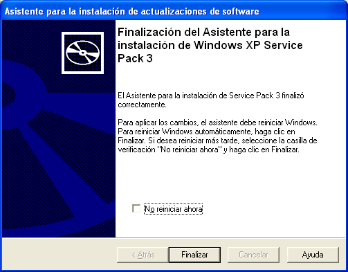 Una vez completada la instalación del SP3 de Windows XP, el sistema mostrará la siguiente ventana, en la cual pulsaremos directamente sobre el botón "Finalizar", para que el equipo se reinicie y pase a ser aplicado dicho service pack de modo efectivo.