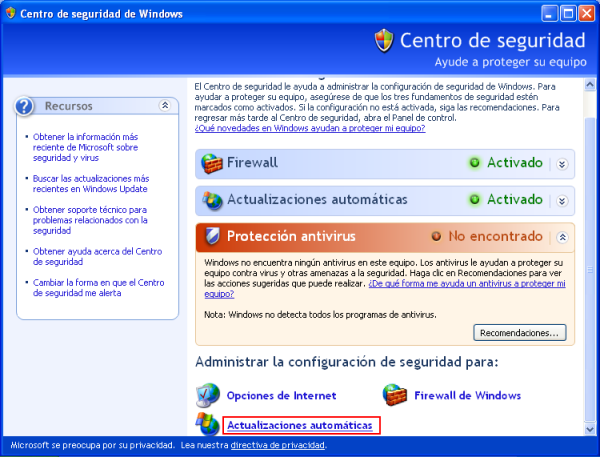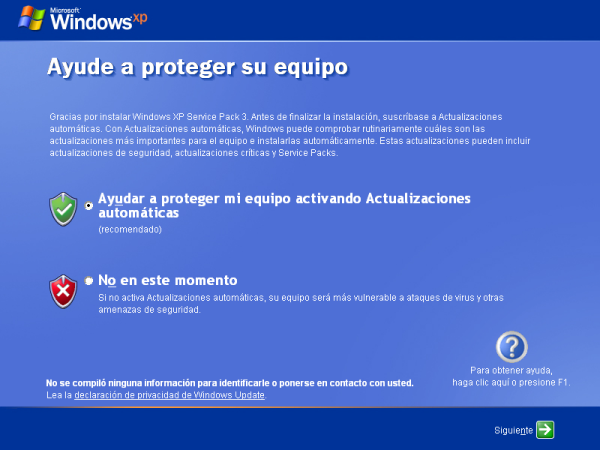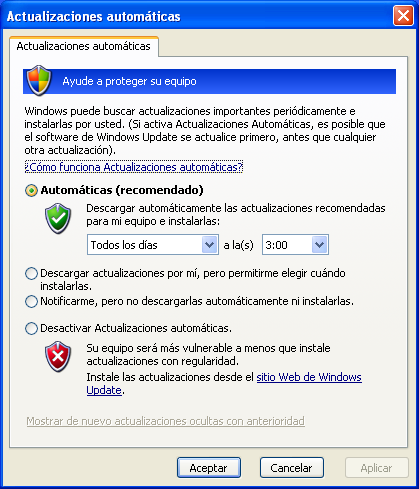 Pese a haber instalado el SP3 para Windows XP en nuestro equipo, presumiblemente habrá aun otros parches que deban instalarse en el mismo para solventar problemas que hayan sido detectados tras la aparición del SP3; para ese fin hemos configurado las "Actualizaciones automáticas", de modo que el propio equipo busque dichos parches para que sean instalados de modo automático.