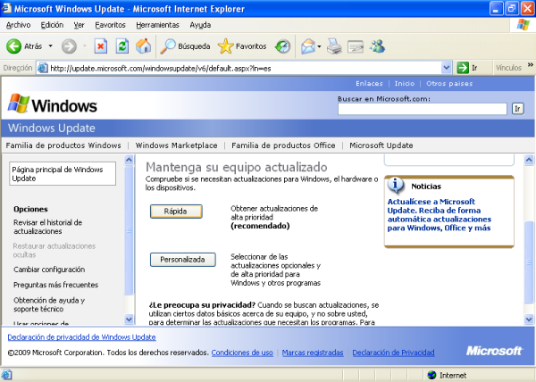 Pese a lo indicado en el párrafo anterior, y dado que estamos instalando un nuevo equipo, podemos "forzar" en este instante la búsqueda de parches para nuestro equipo, sin esperar a que "Actualizaciones automáticas" los busque; para ello deberemos ejecutar "Inicio ► Todos los Programas ► Windows Update", pasando a ser mostrada la siguiente ventana, en la que pulsaremos directamente sobre el botón "Rápida" para proceder a una rápida búsqueda de parches para nuestro equipo.