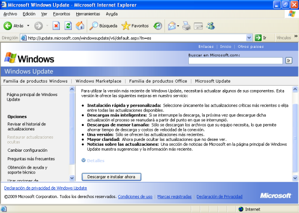 Es posible que antes de descargar los parches indicados, se nos muestre la siguiente ventana que nos informará de que será preciso instalar en nuestro equipo una versión más actual de "Windows Update", así pues pulsaremos en dicha ventana sobre el botón "Descargar e instalar ahora" para proceder con dicha actualización.