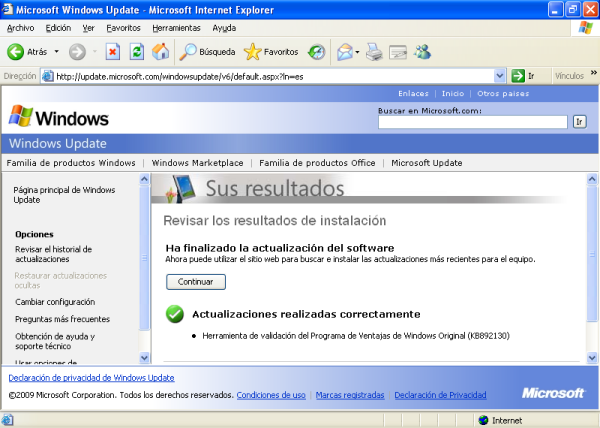 De vuelta a la página web de "Windows Update", se nos mostrará la siguiente información, que nos indica que la actualización ha sido efectuada correctamente; pulsaremos en dicha ventana directamente sobre el botón "Continuar".