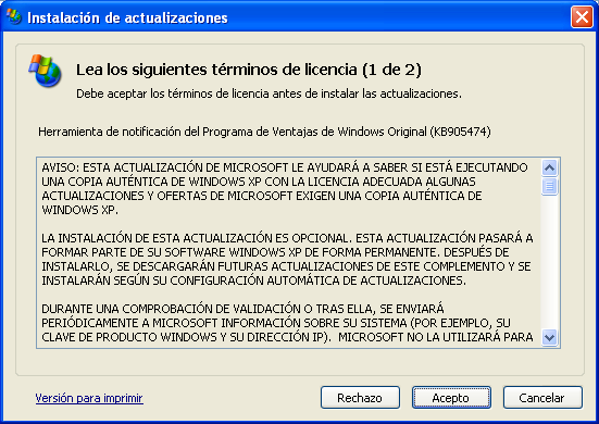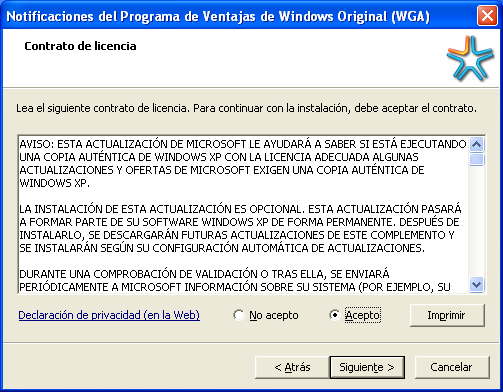 Como resultado de la acción anterior nos será mostrada la siguiente ventana de acuerdo del contrato de licencia de la "Herramienta de notificación del Programa de ventajas de Windows Original", en la cual pulsaremos sobre pulsar botón "Acepto".