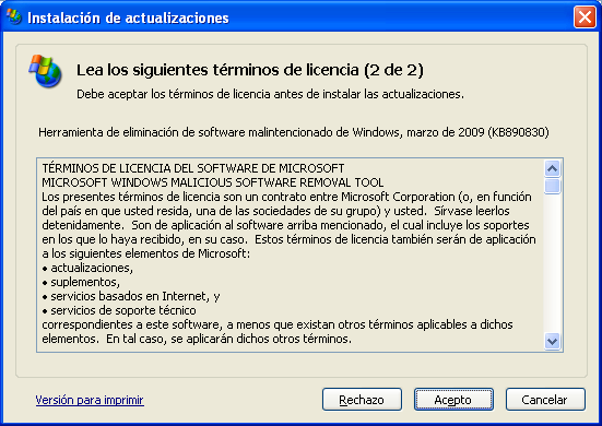 A continuación nos será mostrada la siguiente ventana de acuerdo del contrato de licencia de la "Herramienta de eliminación de software malintencionado de Windows", en la cual pulsaremos de nuevo sobre pulsar botón "Acepto".