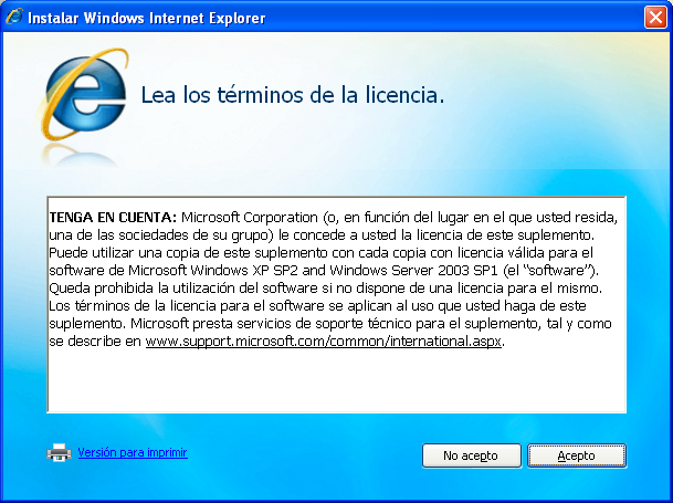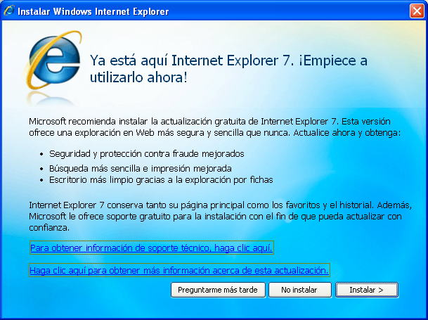 Una de las actualizaciones que se efectuará consistirá en instalar Internet Explorer 7, presentándosenos en un momento determinado de la actualización la siguiente ventana, en la que pulsaremos directamente sobre el botón "Instalar >".
