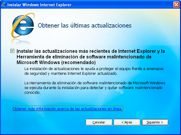 Tras ello se nos presentará la siguiente ventana, en la cual dejaremos activada la casilla "Instalar las actualizaciones más recientes de Internet Explorer y la Herramienta de eliminación de software malintencionado de Microsoft Windows (recomendado)", pulsando en ella directamente sobre el botón "Siguiente".
