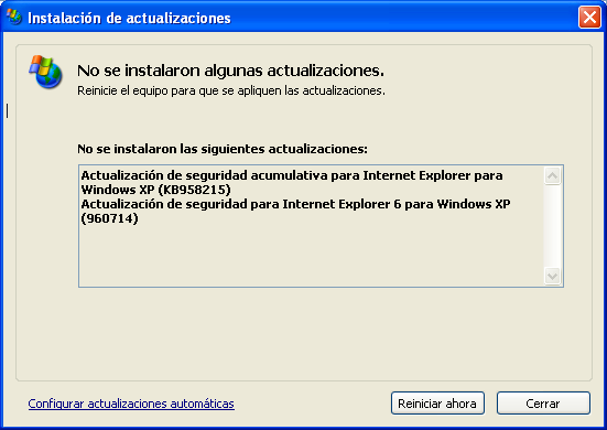 Una vez completado el proceso de instalación de Internet Explorer 7 y del resto de parches, es posible que el equipo solicite un reinicio para que las actualizaciones instaladas pasen a ser efectivas, luego en la ventana de la imagen inferior pulsaremos directamente sobre el botón "Reiniciar ahora".