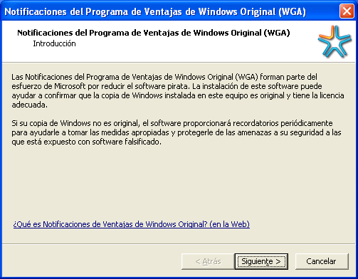 A continuación se nos presenta la siguiente ventana, en la que seleccionaremos el radio botón "Acepto", para aceptar las condiciones de licencia para el uso del programa de ventajas de Windows Original, y tras ello pulsaremos sobre el botón "Siguiente".