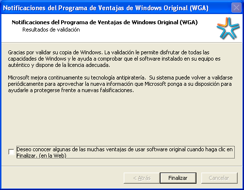 Una vez completado el proceso de instalación anterior, se nos presentará la siguiente ventana, en la que desactivaremos la casilla "Deseo conocer algunas de las muchas ventajas de usar software original cuando haga clic en Finalizar. (en la Web)", y tras ello pulsaremos sobre el botón "Finalizar".