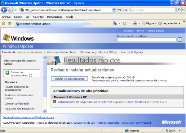 A continuación volveremos a ejecutar "Inicio ► Todos los Programas ► Windows Update", por si hubiera alguna actualización aun pendiente de ser instalada; en este caso, tal y como vemos en la ventana de la imagen inferior, aun quedaría por instalar una actualización para Internet Explorer 7, luego pulsaríamos en dicha ventana sobre el botón "Instalar las actualizaciones" para proceder con la instalación de dicho parche.