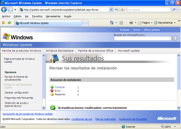 Tras ello, comprobaríamos que todos los parches que había para nuestro equipo han sido instalados satisfactoriamente, tal y como vemos en la ventana de la imagen inferior, luego ya estaremos en condiciones de asegurar que hemos instalado todos los parches existentes actualmente para nuestro equipo; a partir de este instante, los nuevos parches que pudieran ir surgiendo, serán instalados en nuestro equipo de modo automático, debido a la configuración realizada con anterioridad en "Actualizaciones automáticas".