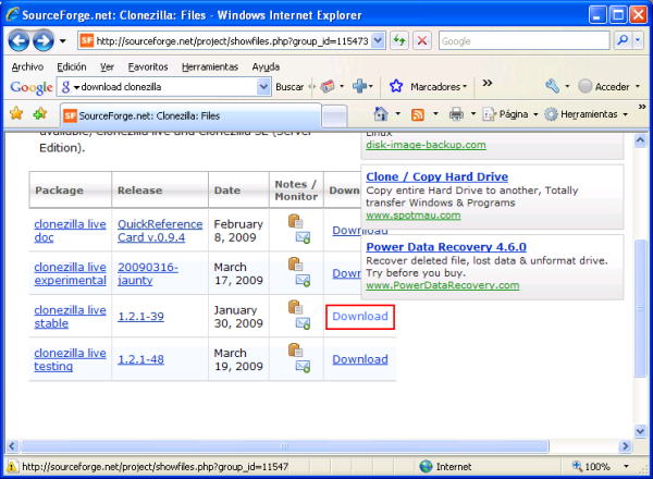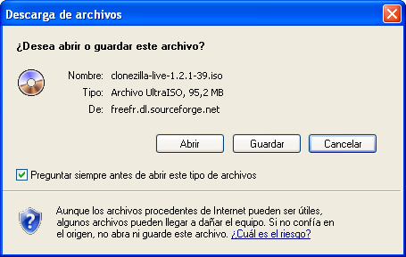 En el momento de elaborar este apartado existía en la red la posibilidad de descargar de modo gratuito una versión de la imagen ISO del CD-Live del software de clonación CloneZilla desde la URL "http://sourceforge.net/projects/clonezilla", concretamente para la última versión disponible era el "CloneZilla 1.2.1", versión que utilizaremos en este apartado.